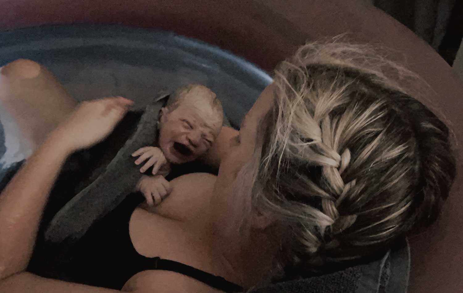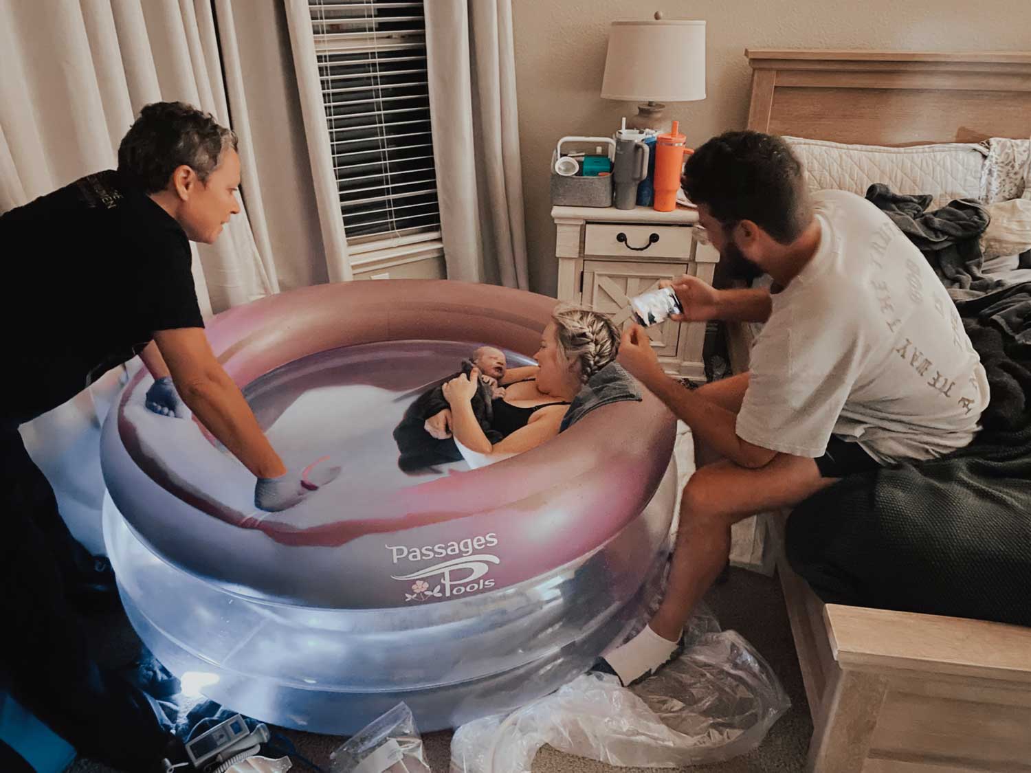 The contractions were very strong but still inconsistent. I was texting my close friend saying things like “these are so strong but just so confused why they aren’t getting closer together!” I had even told my mom, “these contractions feel like I’m dilated to about a 7 but I doubt that’s true because they are still inconsistent.” It was frustrating! And then boom. It all hit so fast! By 7:15 pm I had gotten in my bed because I could barely sit up straight anymore and I started having the “labor shakes” from all the adrenaline. I knew I was transitioning and my body was ready all of the sudden. I told Philip to call Olivia and fill up the birth tub. Philip said “are you sure, the contractions still aren’t super regular?” I knew though. I told him I was very sure. It all became a bit rushed! Olivia got there quickly and Philip was finishing filling up the tub. Olivia walked in smiling saying “you’re going to meet your baby today!”